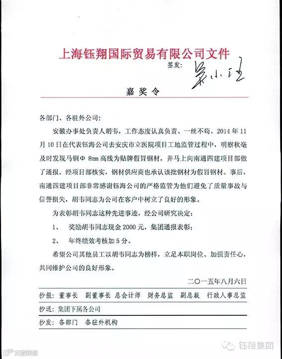 8月6日,集团下属上海钰翔国际贸易有限公司颁布嘉奖令,对安徽办事处员工胡韦进行通报表彰。表彰他在2014年11月10日代表江苏钰海建材贸易有限公司监管安庆市立医院项目工地钢材配送的过程中,严格监管,发现问题并及时通报处置,为项目施工方——南通四建避免了重大的质量事故和经济、信誉损失,为公司树立了良好的企业形象。
