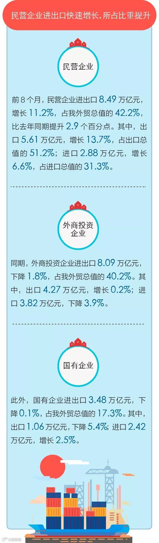 前8个月,民营企业进出口8.49万亿元,增长11.2%,占我外贸总值的42.2%,比去年同期提升2.9个百分点。其中,出口5.61万亿元,增长13.7%,占出口总值的51.2%;进口2.88万亿元,增长6.6%,占进口总值的31.3%。