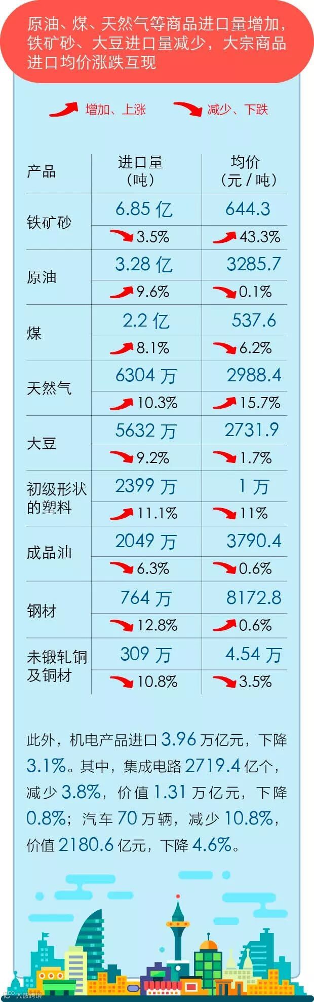 此外,机电产品进口3.96万亿元,下降3.1%。其中,集成电路2719.4亿个,减少3.8%,价值1.31万亿元,下降0.8%;汽车70万辆,减少10.8%,价值2180.6亿元,下降4.6%。