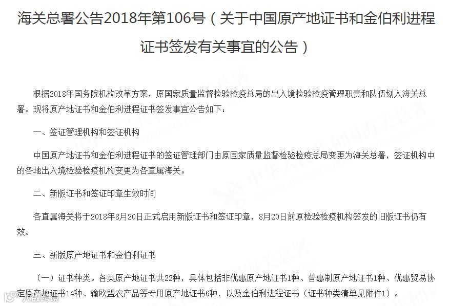 与此同时,海关也正式发布了2018年第106号文,根据关检融合工作的统一安排,新版原产地证书,将使用海关的印章样式。