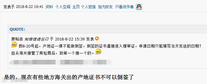 但是这个操作习惯,在海关、商检融合后,可能将不行了!近日,多个外贸人反馈,自8月20日启用新证书后,原商检局(现海关)颁发的产地证将一律不能做倒签,倒签的证书直接进入缓审,申请日期只能填写当天发送的系统日期!请大家务必注意,相互转告!