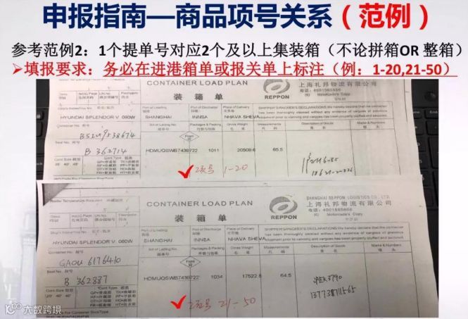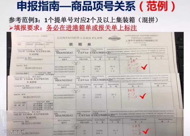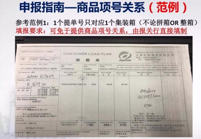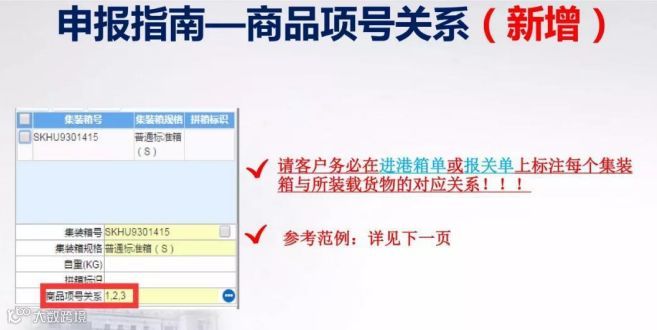 4、集装箱商品项号关系:需填报每个集装箱对应的商品项号,即需明确每个集装箱内分别装有哪些货物