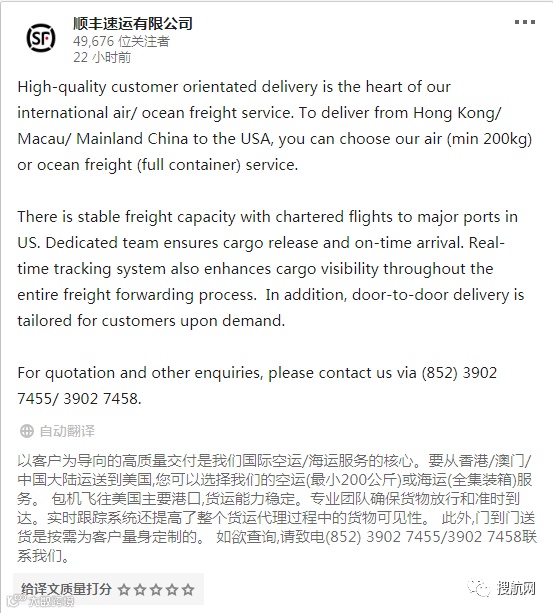 昨天(24日)下午6点,顺丰通过其官方领英号发布通知:顺丰将提供从香港/澳门/中国大陆运送到美国,您可以选择我们的空运(最小200公斤)或海运(全集装箱)服务!
