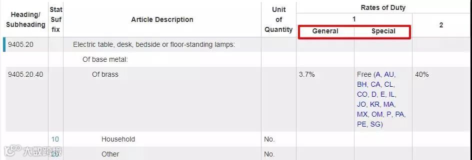 查询进口关税:搜索页面中Rates of Duty 1左边一栏“General”为一般进口税率,右边一栏“Special”是美国对特定国家征收的进口税率。