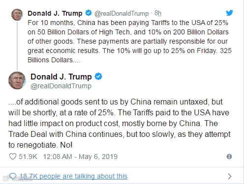 特朗普在twitter上表示“10个月来,中国对500亿美元的高科技产品征收25%的关税,对2000亿美元的其他商品征收10%的关税。这些支出是我们取得巨大经济成果的部分原因,”特朗普在推特上写道。“10%将在周五升至25%。”特朗普威胁要在今年1月和3月之前把关税提高到25%,然后又把最后期限往后推,目的是让美国在与中国的贸易谈判中拥有更大的影响力。