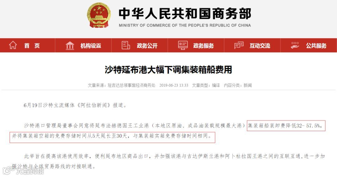 沙特港口管理局董事会同意将延布法赫德国王工业港(本地区原油、成品油装载规模最大港)集装箱船装卸费降低32- 57.5%,并将集装箱空箱的免费存储时间从5天延长至30天,与集装箱实箱免费存储时间相同。
