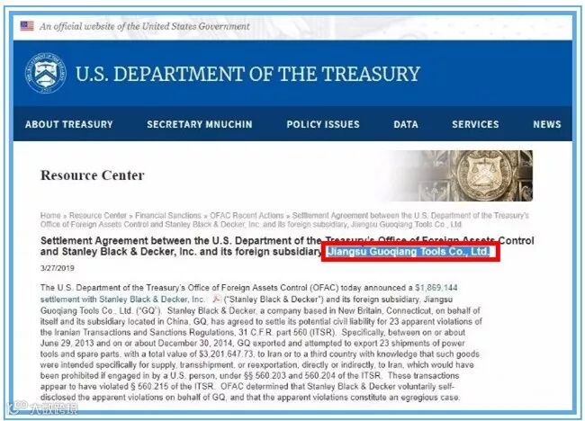 美国财政部于3月27日宣布,与美国上市公司史丹利百得集团(Stanley Black & Decker)及其在中国的全资子公司江苏国强工具有限公司达成和解协议,后者将支付186.9万美元的罚款以对其在2013和2014年期间23次违反美国制裁向伊朗进行出口的行为达成和解。