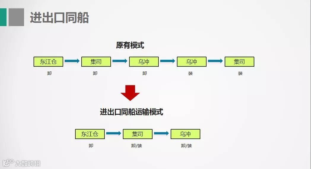 进出口同船运输指经海关核准备案的监管船舶,同时承载进口和出口集装箱货物的运输,由来往港澳小型船舶运输。