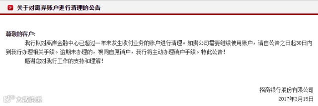 招商银行曾在今年3月发布过《关于对离岸账户进行清理的公告》: