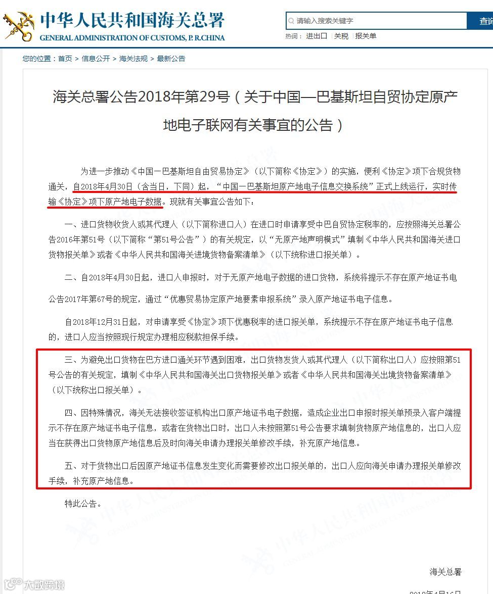 根据海关总署公告2018年第29号,自2018年4月30日(含当日,下同)起,“中国—巴基斯坦原产地电子信息交换系统”正式上线运行,实时传输《协定》项下原产地电子数据。