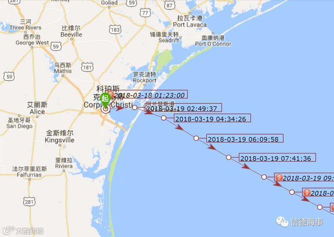 今年3月19日,该轮在美国德克萨斯州Corpus Christi ,Archer-Daniels-Midland Co.所属码头满载高粱准备前往中国上海。
