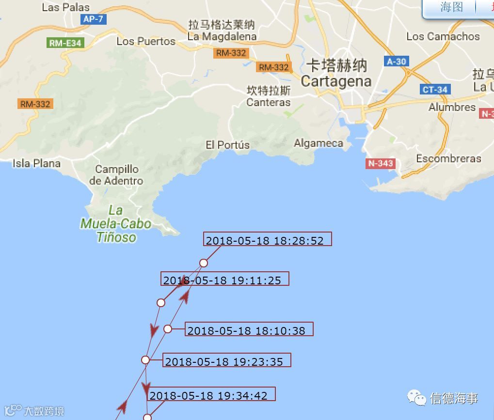 如下图,5月18日,该轮刚抵达西班牙卡塔赫纳港。
