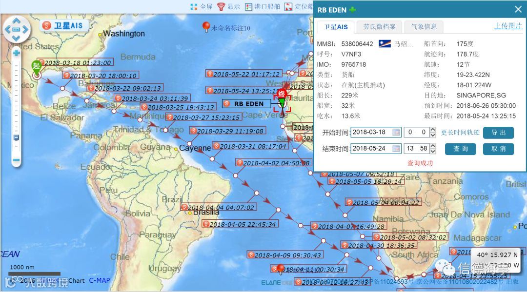 如下图,为船讯网为信德海事网提供的该轮从今年3月18日到今天的航行轨迹图。