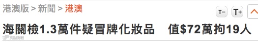 2017年12月,香港海关在油麻地、旺角、佐敦10间药坊及药房搜获5200件冒牌化妆品及护肤品,价值67万港元,不排除部分已流入市面。