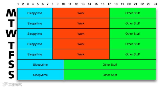 一个完美的工作日开始于早上8点到9点,结束于下午5点到6点。这样的生活方式。按照8小时工作日来计算,每周的工作时间应该是40个小时。理想状态下,他的生活节奏是这样的: