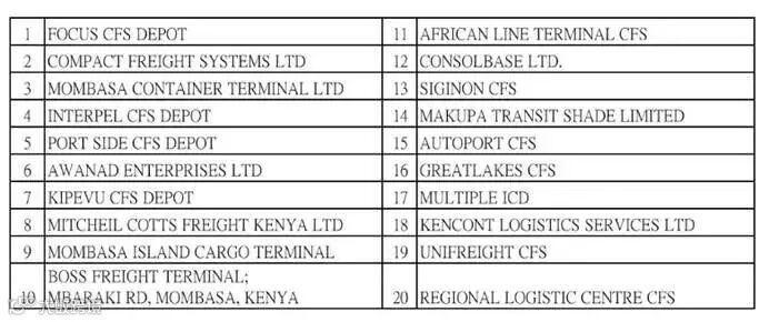 根据长荣通知,由于肯尼亚政府的突然行动,所有到肯尼亚蒙巴萨(Mombasa)的当地货载,若没有在提单转运条款栏位显示通知中20个堆场中的任意一个,肯尼亚主管部门将强制把货载由新的SGR铁路转运到距离蒙巴萨(Mombasa)600公里外的内罗毕(Nairobi)的 Embakasi 堆场,费用由收货人承担。