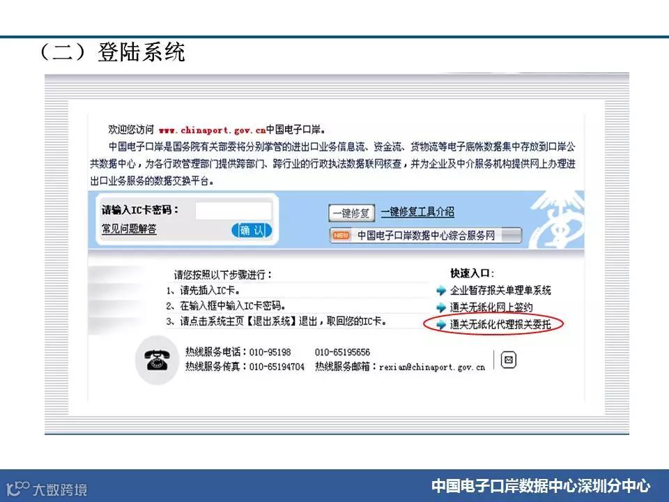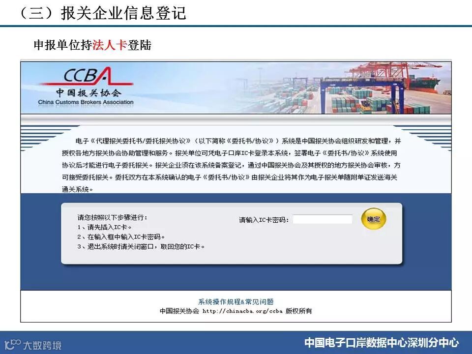 2、浏览器请使用IE8的配置;使用电子口岸IC卡登录系统,报关企业信息登记/变更请用法人卡,发起委托可以是操作员卡;