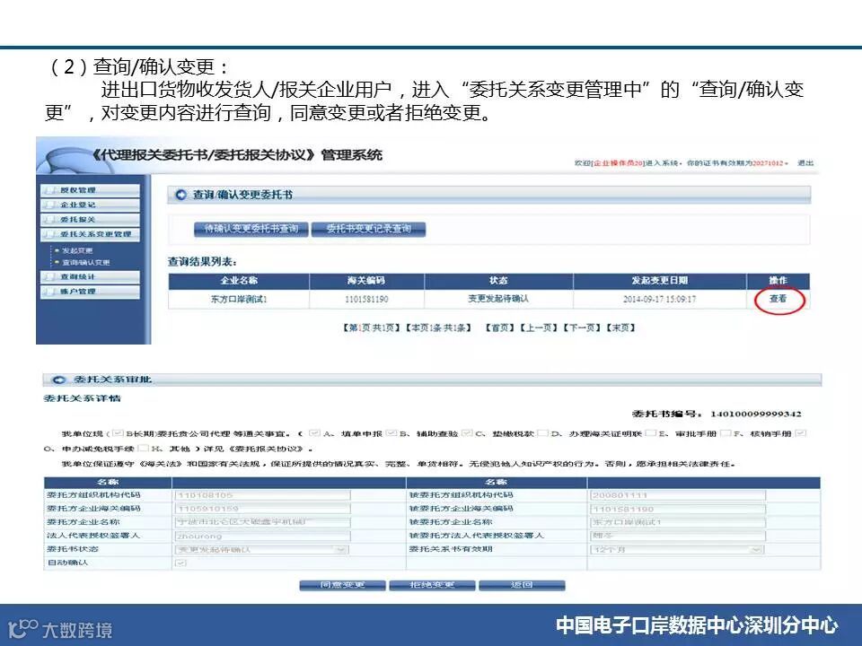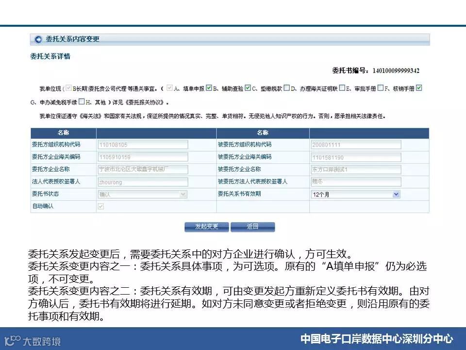 答:(1)在电子口岸端办理变更业务后,已生效的委托书内容不会自动更新为新的信息,直到委托书过期。经与数据中心确认,该情况不会影响企业的代理报关委托业务。