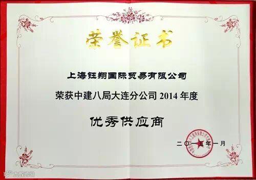 今年1月,在中建八局大连分公司2014年度供应商表彰大会上传来好消息,集团下属子公司上海钰翔国际贸易有限公司被评为“2014年度优秀供应商”。这也是该公司评出的仅有的三家钢材优秀供应商之一,表明中建八局对集团三十年来坚持“诚信、服务、合作、共赢”的经营理念和“四个百分之百”的服务准则的充分认可。