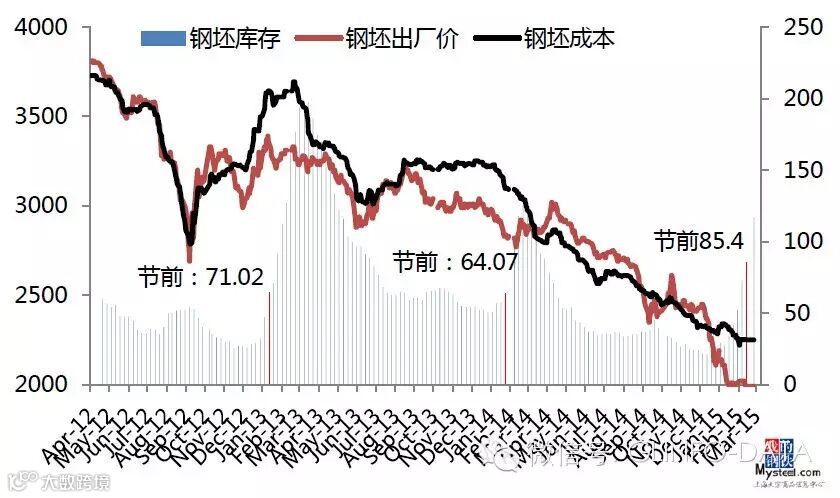 三、钢坯库存预期压力陡现,不过考虑到钢坯出厂价已明显倒挂,价格在下跌过程中可能会有些犹豫和顽强。如下图所示,比较近两年钢坯库存水平,2014年底跟2012年底的情形较为相似,年底时库存偏低,但后面库存上升速度快。而且2015年春节前的基数在近两年中是最高的,为 85万吨,节后上班库存已到117万吨,按这个势头,钢坯的预期压力很大。今年为什么会出现这种局面?可能有几个原因:一是含硼方钢出口受阻,二是炼铁炼钢相对于轧材来说,生产的弹性要差一些,三是不排除节前有人认为钢坯到这个价格差不多可以抄底了……重点是,钢坯的这种格局对后期市场到底意味着什么呢?一方面可能对矿石需求形成压制,另一方面可能会增加后期低成本钢材的供给。