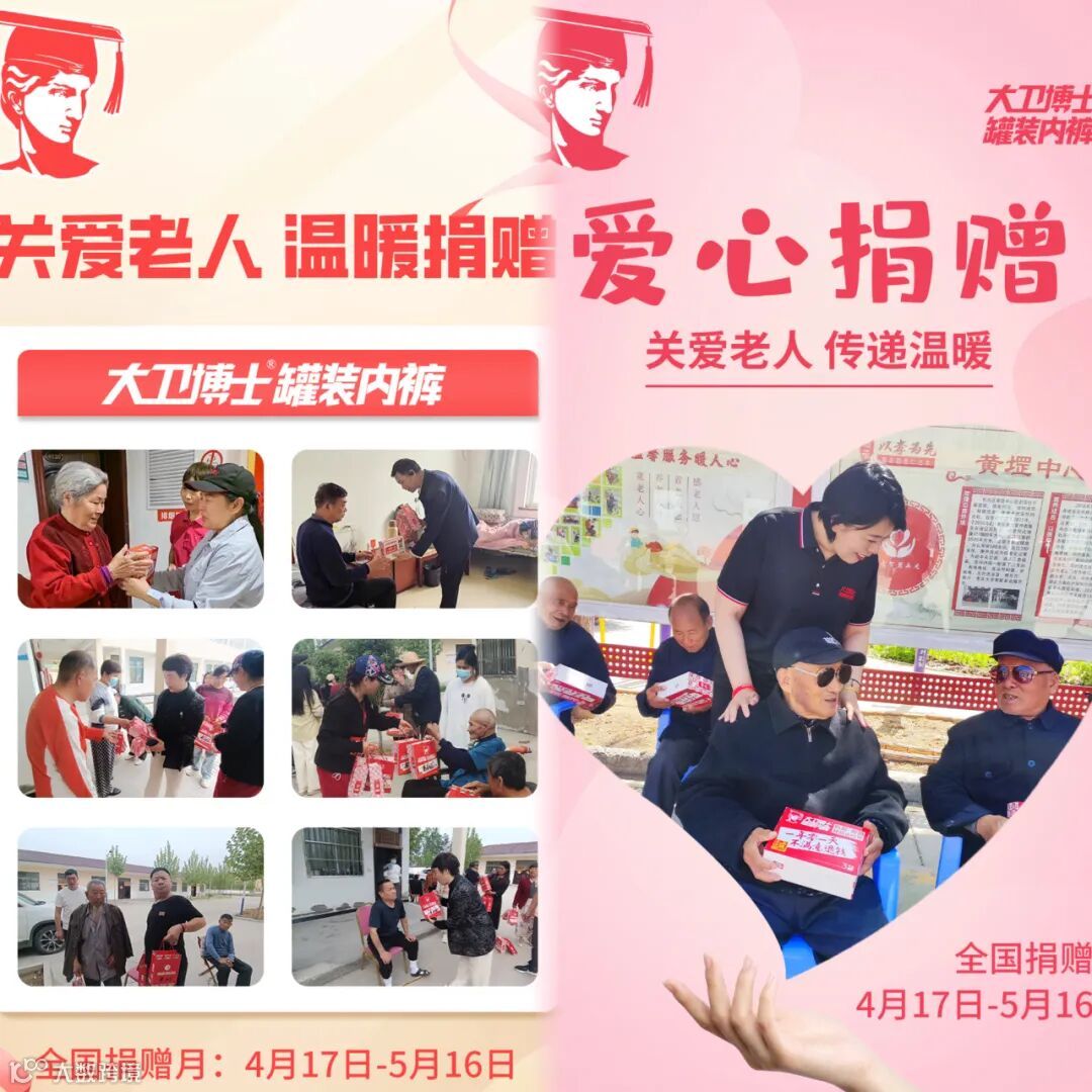 截止到2024年,大卫博士已经向全国617家敬老院进行了爱心捐赠,累计捐赠内裤共41976盒(118428条)。