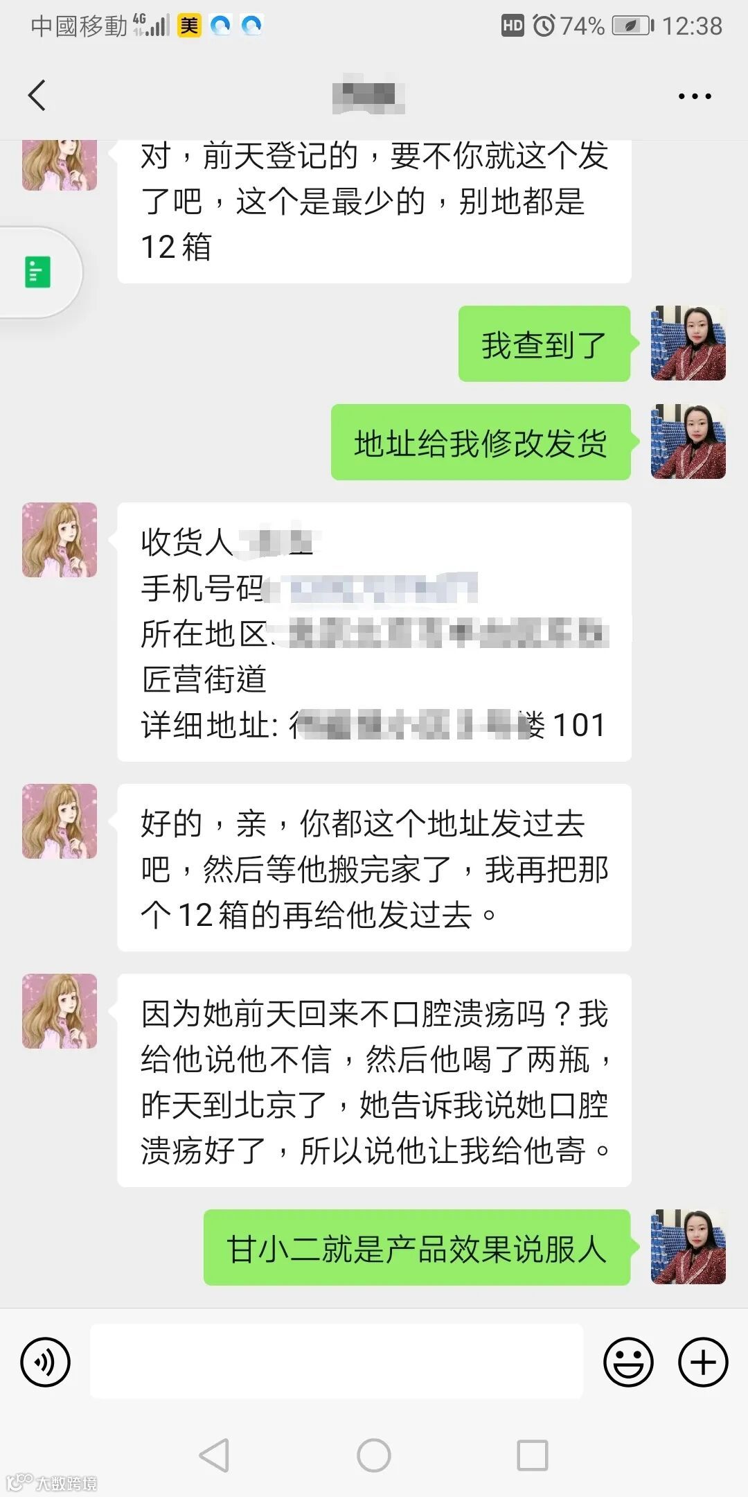 Q:因为她前两天回来不口腔溃疡吗?我给他说他不信,然后他喝了两瓶,昨天到北京了,他告诉我说他口腔溃疡好了,所以说他让我给他寄。