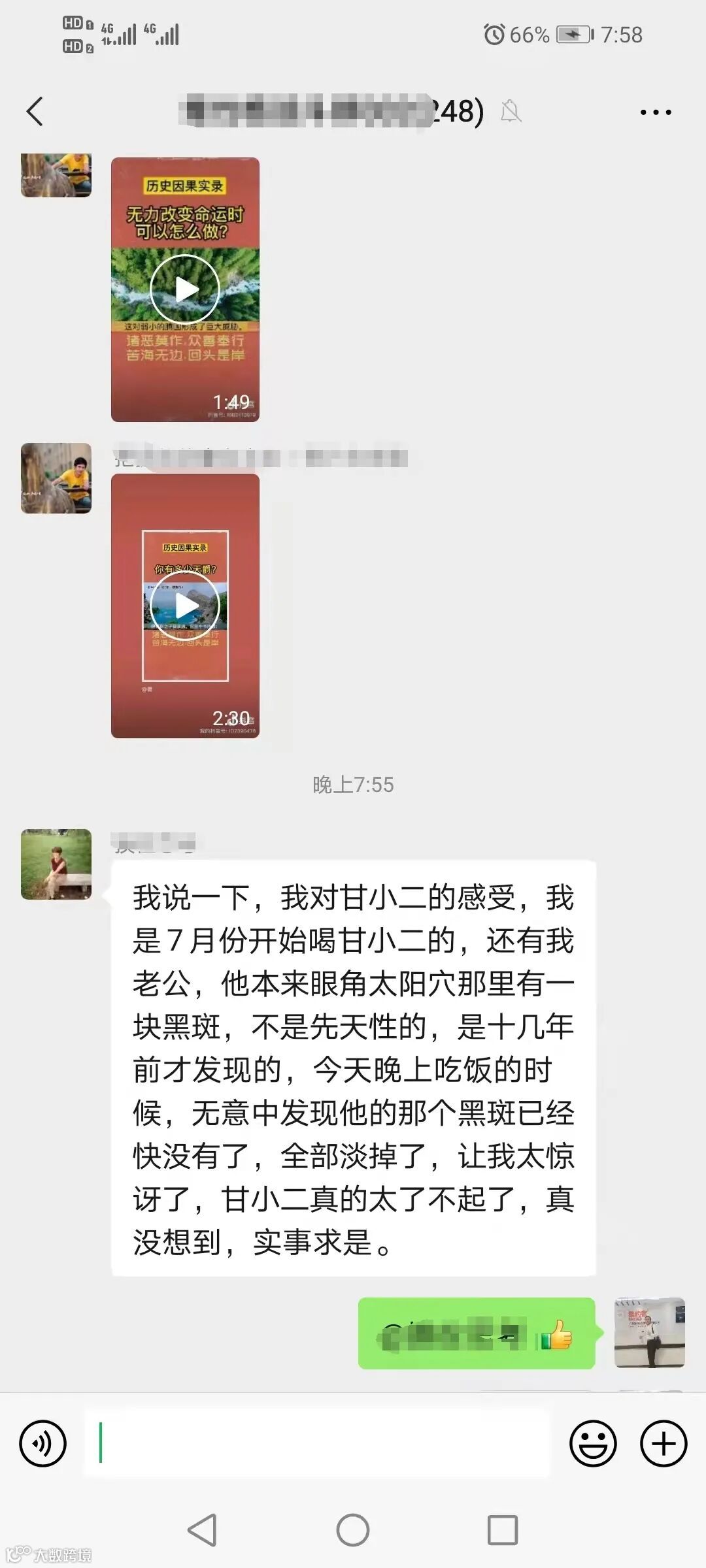 Q:我7月份开始喝甘小二的,还有我老公,他本来眼角太阳穴那里有一块黑斑,不是先天性的,是十几年前才发现的,今天晚上吃饭的时候,无意发现他的那个黑斑已经快没有了...