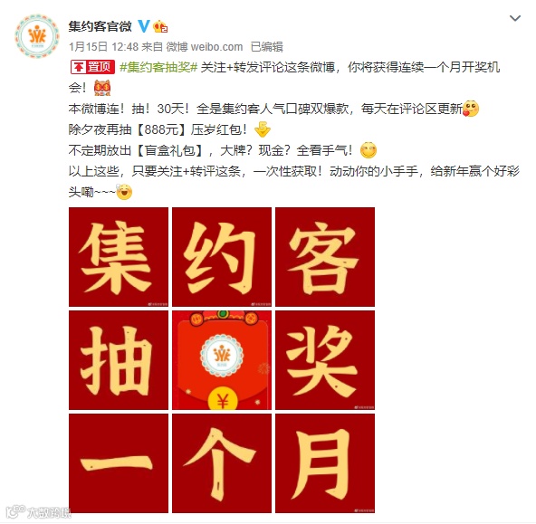 从1月13日到2月11日除夕夜,小集将每天从转发评论里抽出一名天选之子,共送出30份不同的礼物!所有的礼物都来自集约客平台,都是人气口碑双重爆款哦~