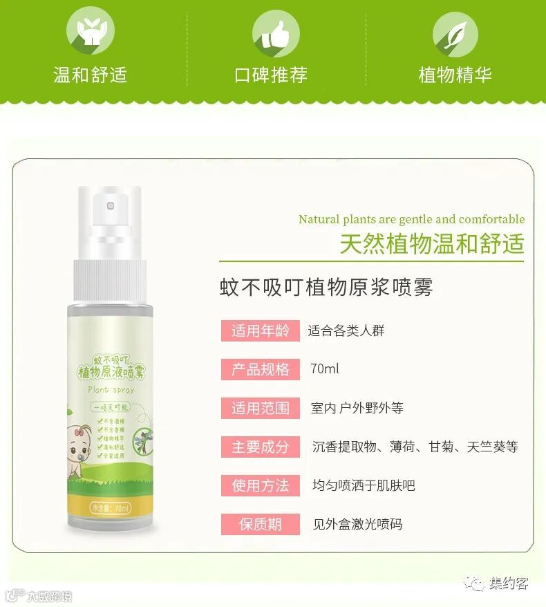 驱蚊时间长久。选用沉香水、香茅、薄荷、芦荟汁等有效成分科学组方,驱蚊效果长达7-8小时;