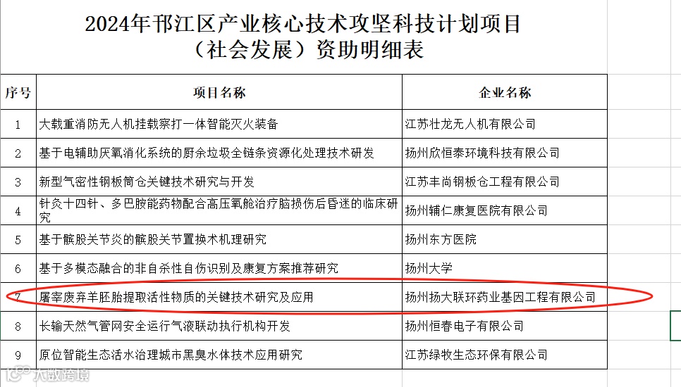 近日,联环基因申报的“屠宰废弃羊胚胎提取活性物质的关键技术研究及应用”获批2024年度邗江区产业核心技术攻坚科技计划项目。