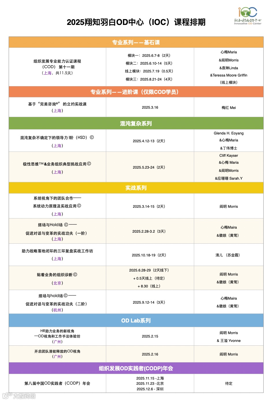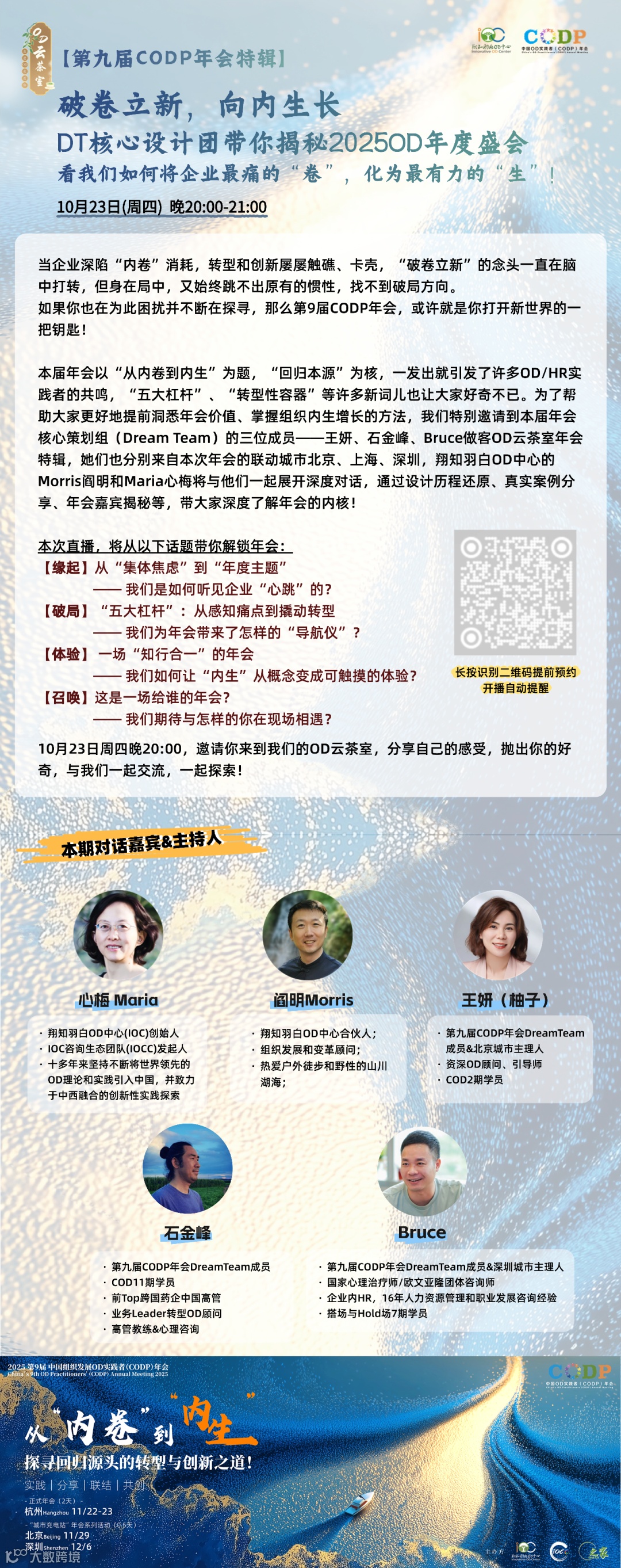 本届年会以“从内卷到内生”为题,“回归本源”为核,一发出就引发了许多OD/HR实践者的共鸣,“五大杠杆”、“转型性容器”等许多新词儿也让大家好奇不已。为了帮助大家更好地提前洞悉年会价值、掌握组织内生增长的方法,我们特别邀请到本届年会核心策划组(Dream Team)的三位成员——王妍、石金峰、Bruce做客OD云茶室年会特辑,她们也分别来自本次年会的联动城市北京、上海、深圳,翔知羽白OD中心的Morris阎明和Maria心梅将与他们一起展开深度对话,通过设计历程还原、真实案例分享、年会嘉宾揭秘等,带大家深度了解年会的内核!