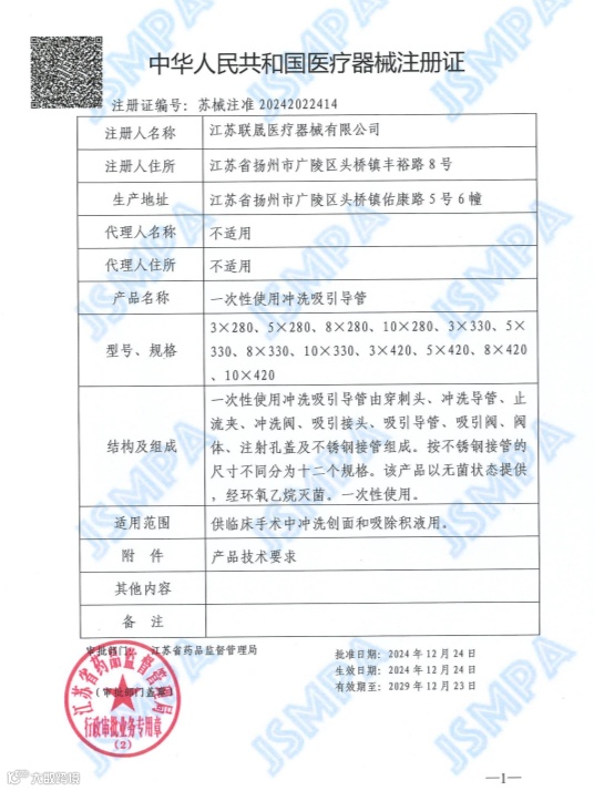 新年添新喜,奋进向未来。近日,江苏联晟医疗器械有限公司“一次性使用冲洗吸引导管”成功获批医疗器械注册证。