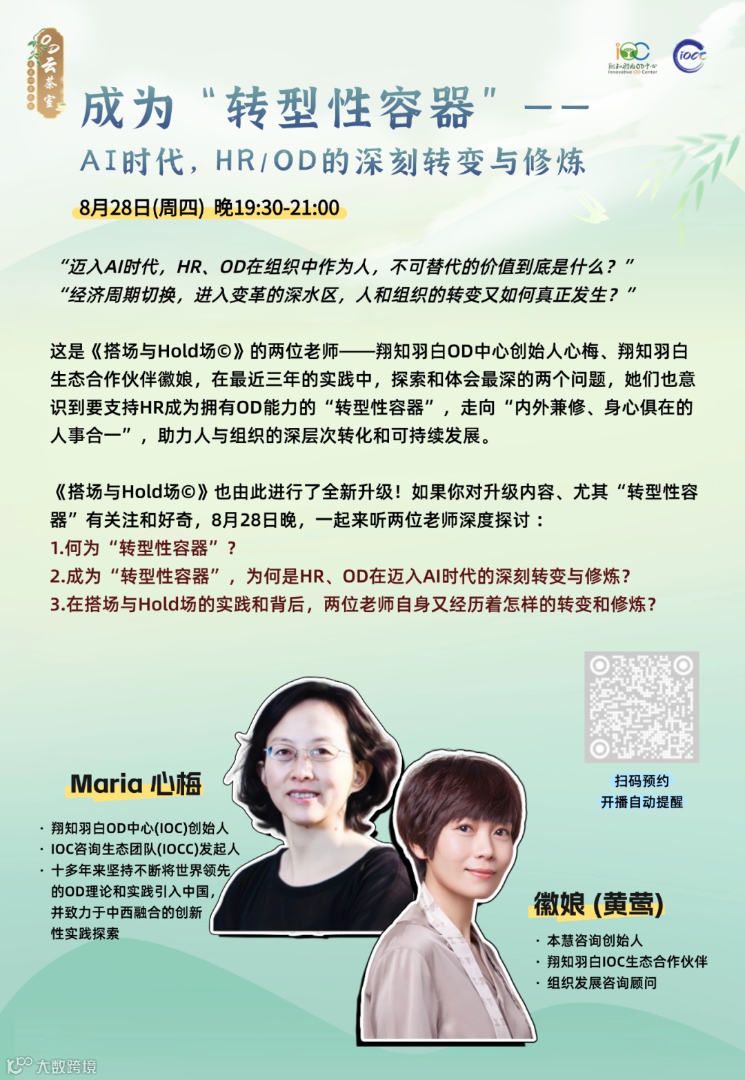 这是《搭场与Hold场©》的两位老师——翔知羽白OD中心创始人心梅、翔知羽白生态合作伙伴徽娘,在最近三年的实践中,探索和体会最深的两个问题,她们也意识到要支持HR成为拥有OD能力的“转型性容器”,走向“内外兼修、身心俱在的人事合一”,助力人与组织的深层次转化和可持续发展。