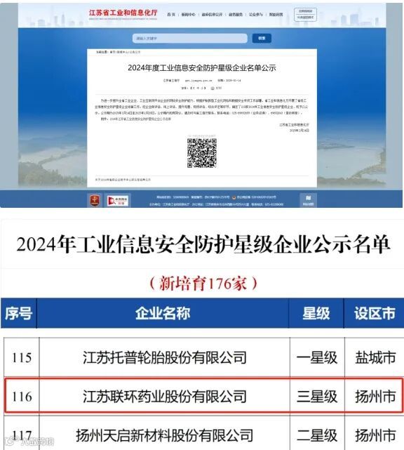 近日,江苏省工信厅公布了2024年度工业信息安全防护星级企业名单,联环股份凭借出色的信息安全建设和工业互联网安全防护能力顺利入选并获得三星等级评定,成为全市唯一一家在新培育领域获得三星等级的企业。