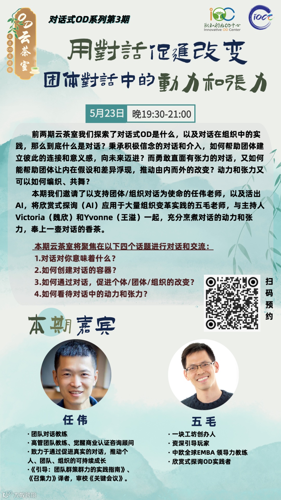 这次我们邀请了以支持团体/组织对话为使命的任伟老师,以及活出AI,将欣赏式探询(AI)应用于大量组织变革实践的五毛老师,与主持人Victoria(魏欣)和Yvonne(王溢)一起,充分烹煮对话的动力和张力,奉上一壶对话的香茶。