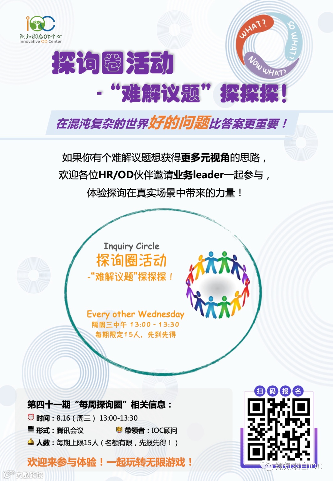 欢迎各位HR/OD来参与,也欢迎各位业务leader带着自己的业务难题来参与,体验探询在真实场景中带来的力量!