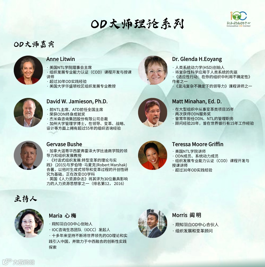 2023年,《OD云茶室》围绕OD的五个核心理论(系统理论,行动研究理理论,变革理论,复杂和混沌理论,对话式OD),完成了5个系列共20期直播。其中我们不仅邀请了各个领域优秀的本土实践者,每个系列我们还特别邀请了一位国外OD大师,从西方的OD视角,结合他们丰富的实战经验,为我们带来了干货满满、值得反复回看学习的分享。