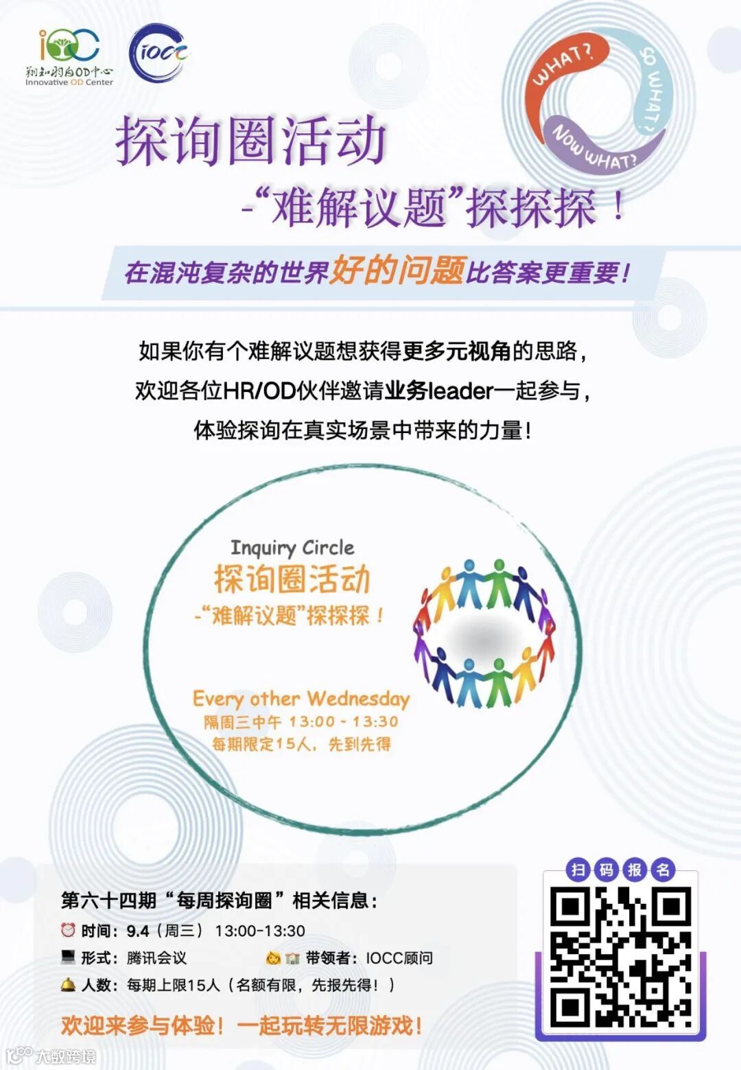 欢迎各位HR/OD来参与,也欢迎各位业务leader带着自己的业务难题来参与,体验探询在真实场景中带来的力量!