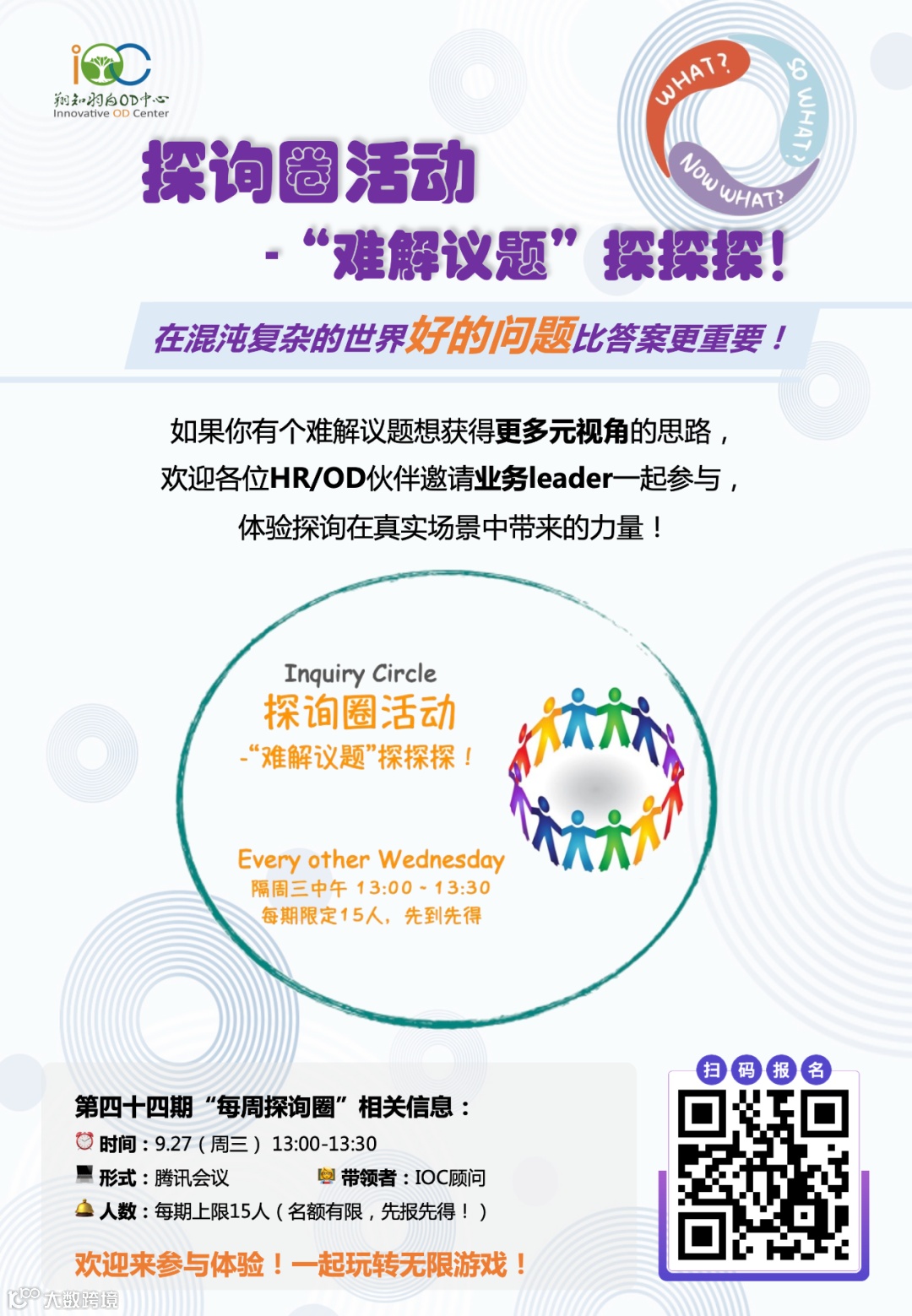 欢迎各位HR/OD来参与,也欢迎各位业务leader带着自己的业务难题来参与,体验探询在真实场景中带来的力量!