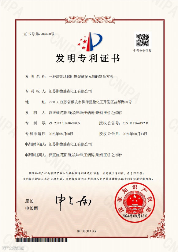 日前,从国家知识产权局传来喜讯,斯德瑞克申报的“一种高效环保阻燃聚醚多元醇的制备方法”获国家发明专利授权,“一种表面活性剂的自动化浸溶装置”和“一种油井水泥用聚醚消泡剂的过滤装置”获实用新型专利授权。