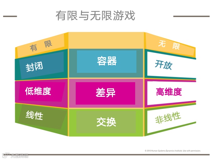 有许多模型、方法、途径教你如何玩有限游戏,但HSD关注的是让你在无限游戏的不确定性中游刃有余的策略。2013年,Eoyang和Holladay将复杂系统的性质描述为:开放地面向多种力量、高维度、非线性。正是这些特征使系统变得复杂,并要求无限游戏具有开放性、响应性、迭代性,从而为韧性和可持续性创造条件。