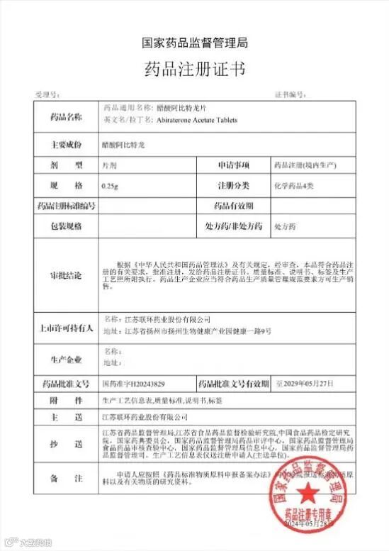 日前,从国家药品监督管理局传来喜讯,联环股份醋酸阿比特龙片获得药品注册证书,药品批准文号为“国药准字H20243829”。