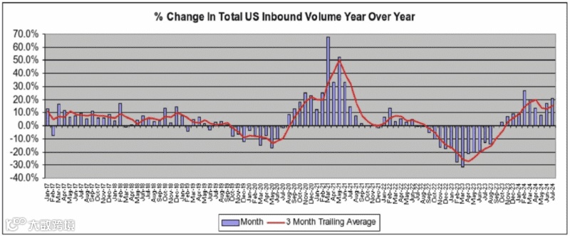 报告还指出,7 月份的入境总吞吐量为 220 万标准箱,比 6 月份高出 7.9%,比 5 月份高出 11.3%,而 5 月份通常被视为美国集装箱进口最繁忙的月份。值得注意的是,2024 年 7 月是入境吞吐量有史以来第三繁忙的月份,仅比 2022 年 5 月创下的纪录低 3.8%。报告强调:“7 月份延续了 5 月份的上升趋势,这本身就表明了进入美国的集装箱吞吐量强劲。”