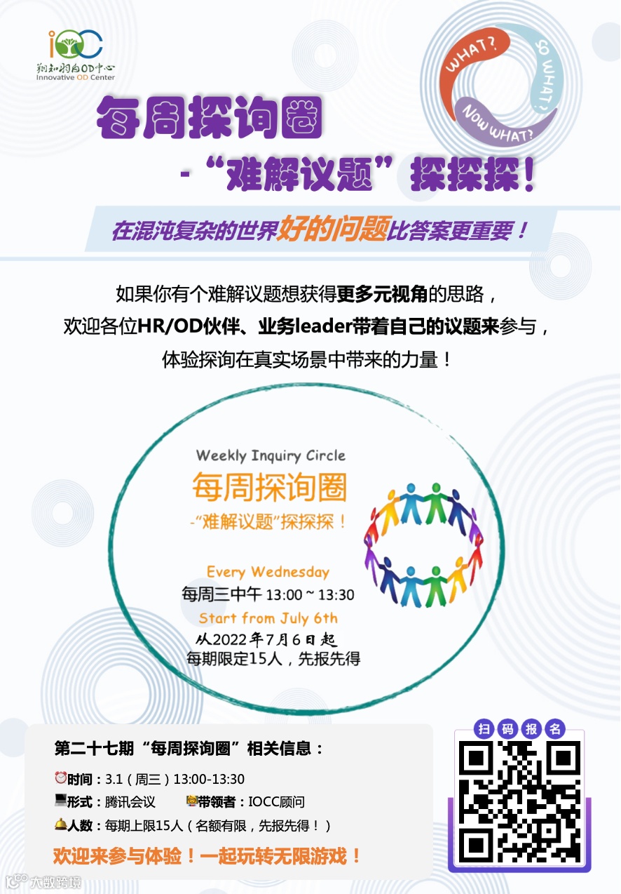 欢迎各位HR/OD来参与,也欢迎各位业务leader带着自己的业务难题来参与,体验探询在真实场景中带来的力量!