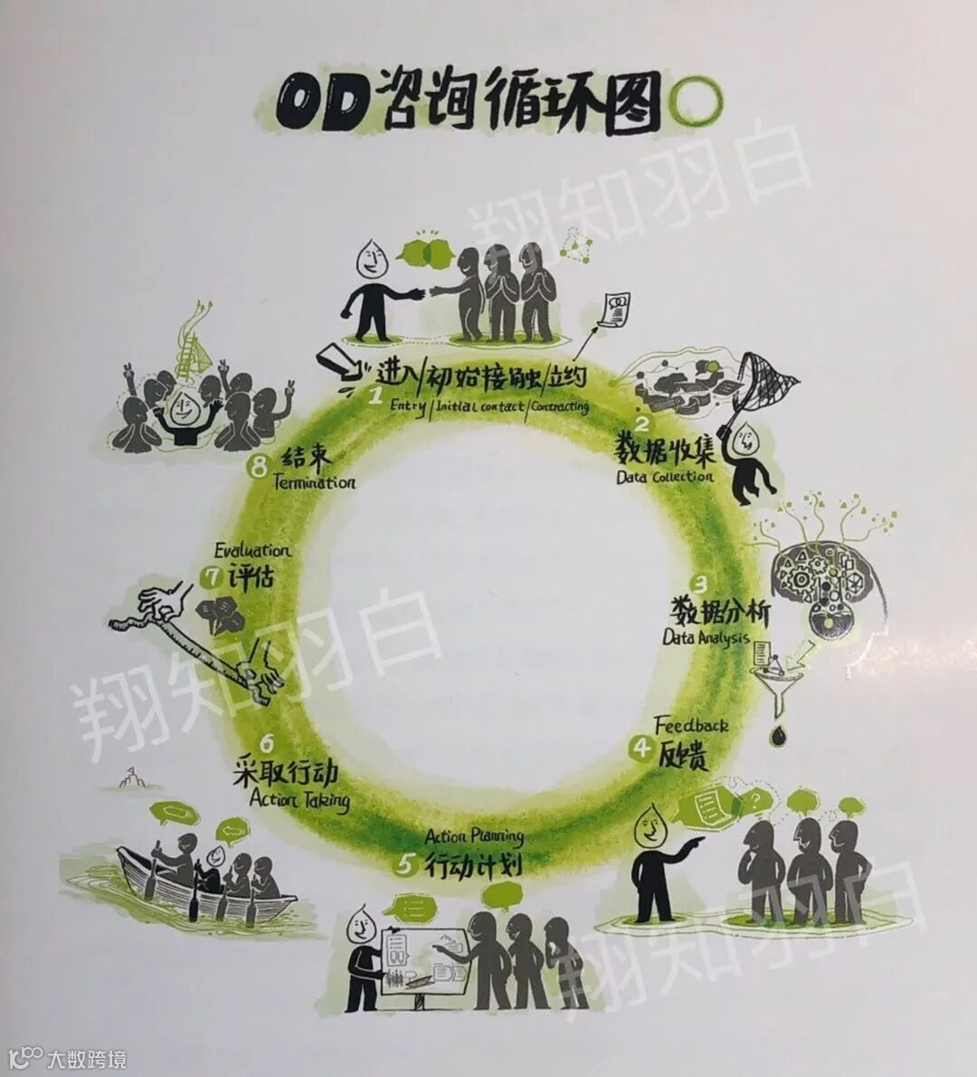 行动研究是OD的脊梁,没有研究就没有行动,没有行动就没有研究。通过行动研究循环可以帮助我们有效地掌握OD咨询的核心流程。大多数的HR实践者习惯从介入(问题、个人、团队等)入手,而发现问题比解决问题更重要,真正的改变是通过对个人的盲点和模式的觉察开始。OD咨询循环提供了一个完整的过程,让每个OD实践者在开展工作时有意识地不会忽略每个阶段,并对每个阶段该做到什么保持关注。