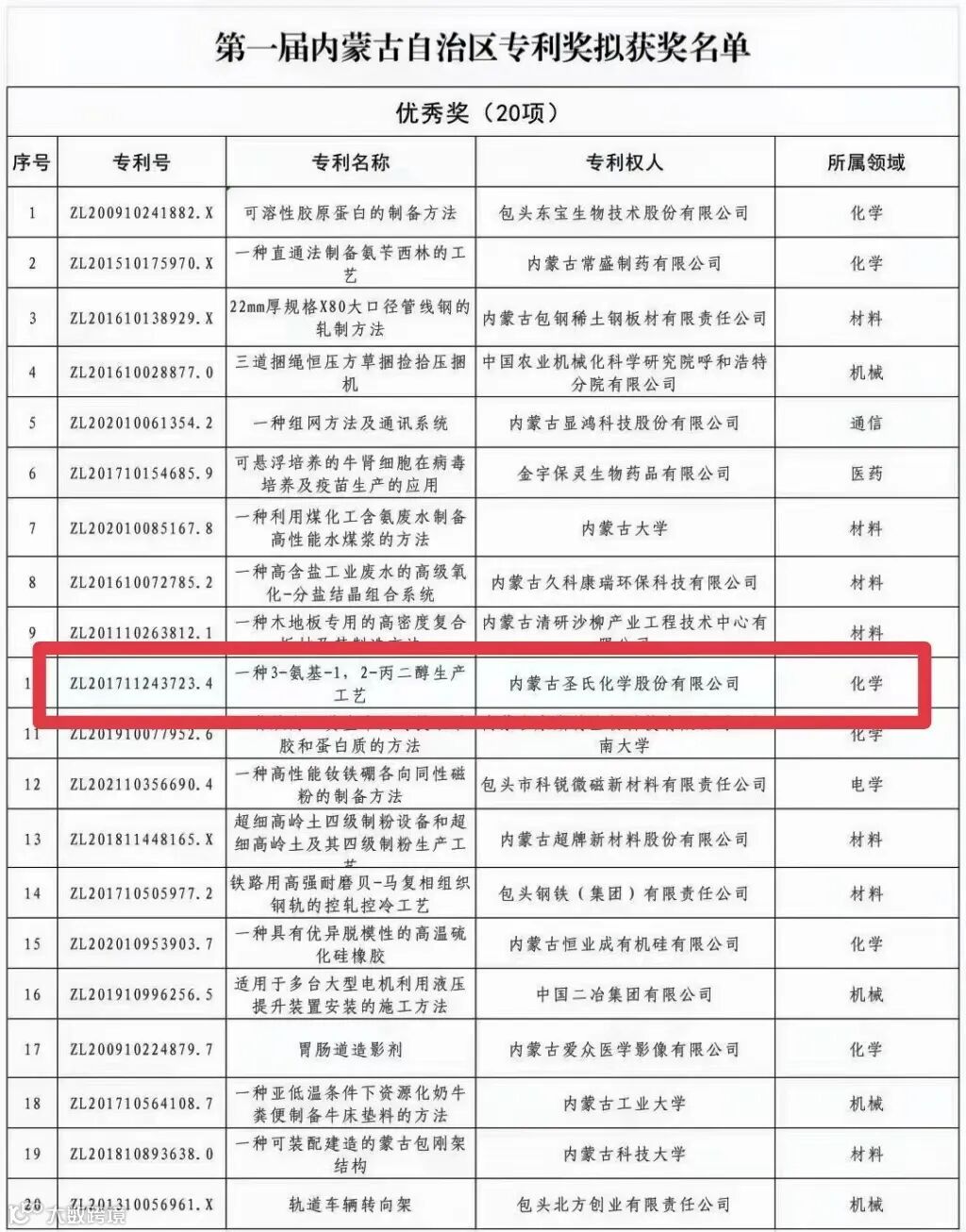 近日,内蒙古自治区市场监管局(知识产权局)公布了第一届自治区专利奖获奖项目,内蒙古圣氏化学股份有限公司申报的“一种3-氨基-1,2-丙二醇生产工艺”荣获第一届内蒙古自治区专利奖评审优秀奖。