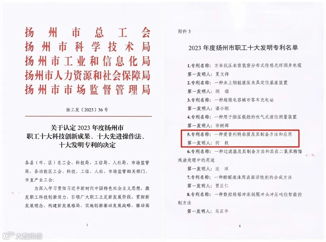 近日,扬州市总工会发布了《关于认定2023年度扬州市职工十大科技创新成果、十大先进操作法、十大发明专利的决定》。经前期个人申报、联环集团工会推荐,市总工会、科技局、工信局、人社局和市场监管局相关领导、专家组成的评审组联合审议、媒体公示,联环股份药物研究所何秋作为第一完成人获得授权的“一种爱普列特杂质及其制备方法和应用”发明专利入选“2023年度扬州市职工十大发明专利”。