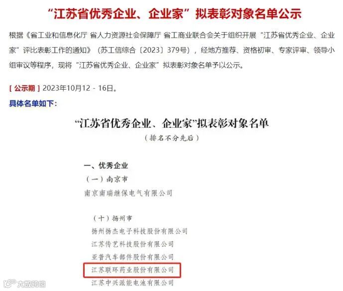 日前,省工业和信息化厅对外发布“江苏省优秀企业、企业家”拟表彰对象名单,江苏联环药业股份有限公司成功入选“江苏省优秀企业”,成为全市唯一上榜的生物医药类企业。