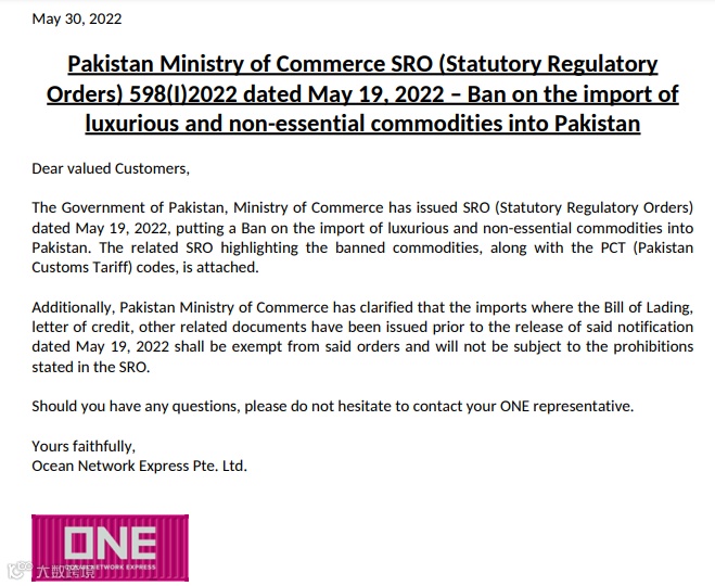继船公司HMM后,又一家船公司ONE发布紧急通知,根据巴基斯坦商务部5月19日发布的SRO法令,禁止将奢侈品和非必需品进口至巴基斯坦。此外,巴基斯坦商务部已表明,在2022年5月19日发布上述通知之前已签发提单、信用证和其他相关文件的进口货物不受影响即不受SRO中规定的禁令的约束。