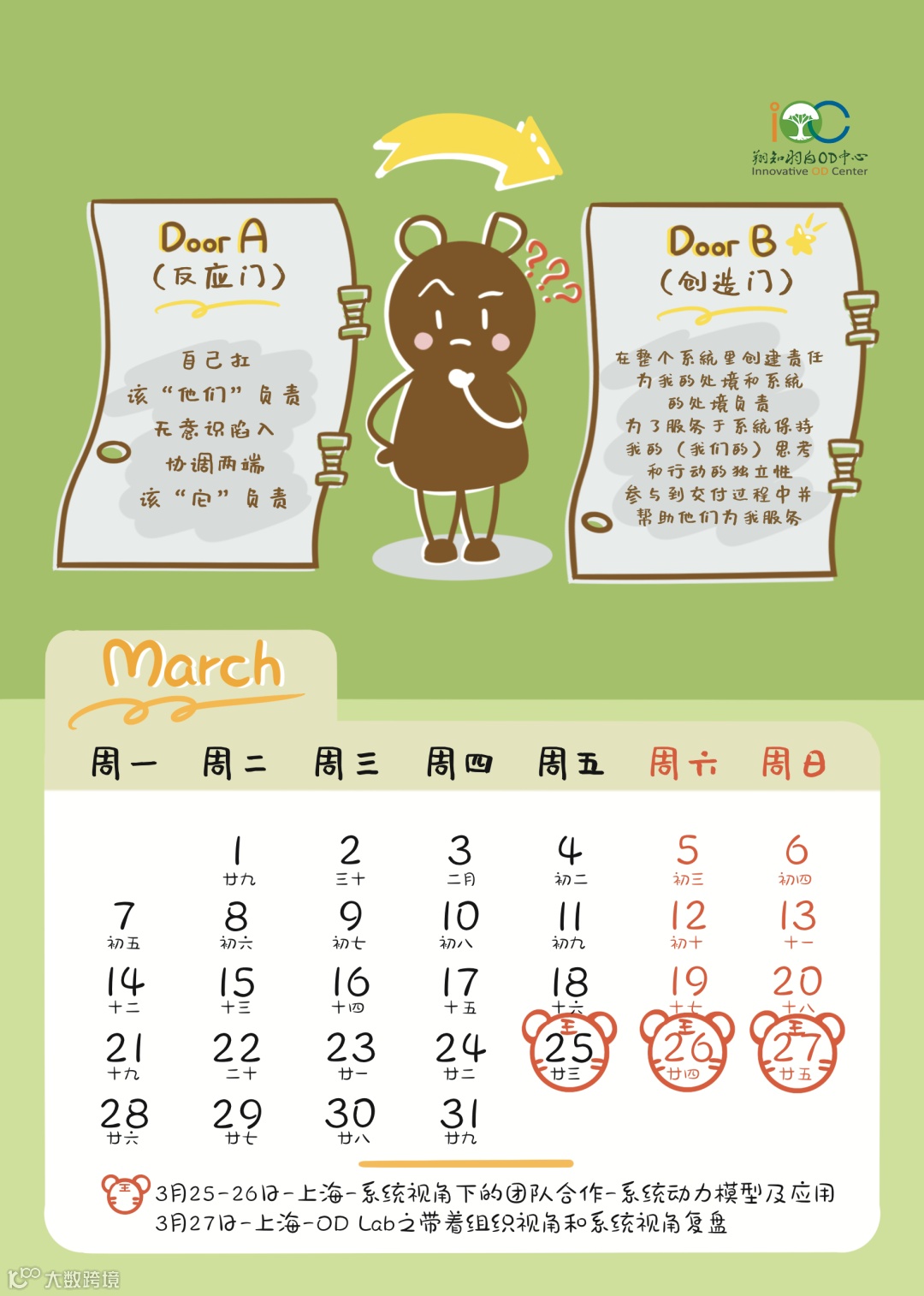 小编注:日历配图中提到的“反应门”(Door A)、“创造门”(Door B)是系统动力模型和理论中的概念,讲述的是在团队、跨团队合作中,人们会陷入怎样的惯性模式(反应门),以及带着觉察可以有什么样不同选择(创造门)。